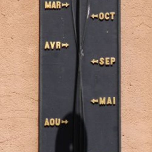 L' « équation du temps » est la différence entre le jour solaire moyen et le jour solaire vrai. Elle est maximale en février (+ 14 minutes) et en novembre (- 16 minutes), et nulle 4 jours seulement par an - vers les 15 avril, 13 juin, 1er septembre et 25 décembre - dont nous retrouvons les points aux intersections de la courbe en forme de 8 avec la ligne droite figurant au milieu du tableau. Notre méridienne intègre l' « équation du temps » par la représentation de la courbe en forme de 8 qui figure en relief sur son tableau. Les conventions établies par l'homme pour régler ses horloges et compter les heures sont les seules responsables de ces singularités.