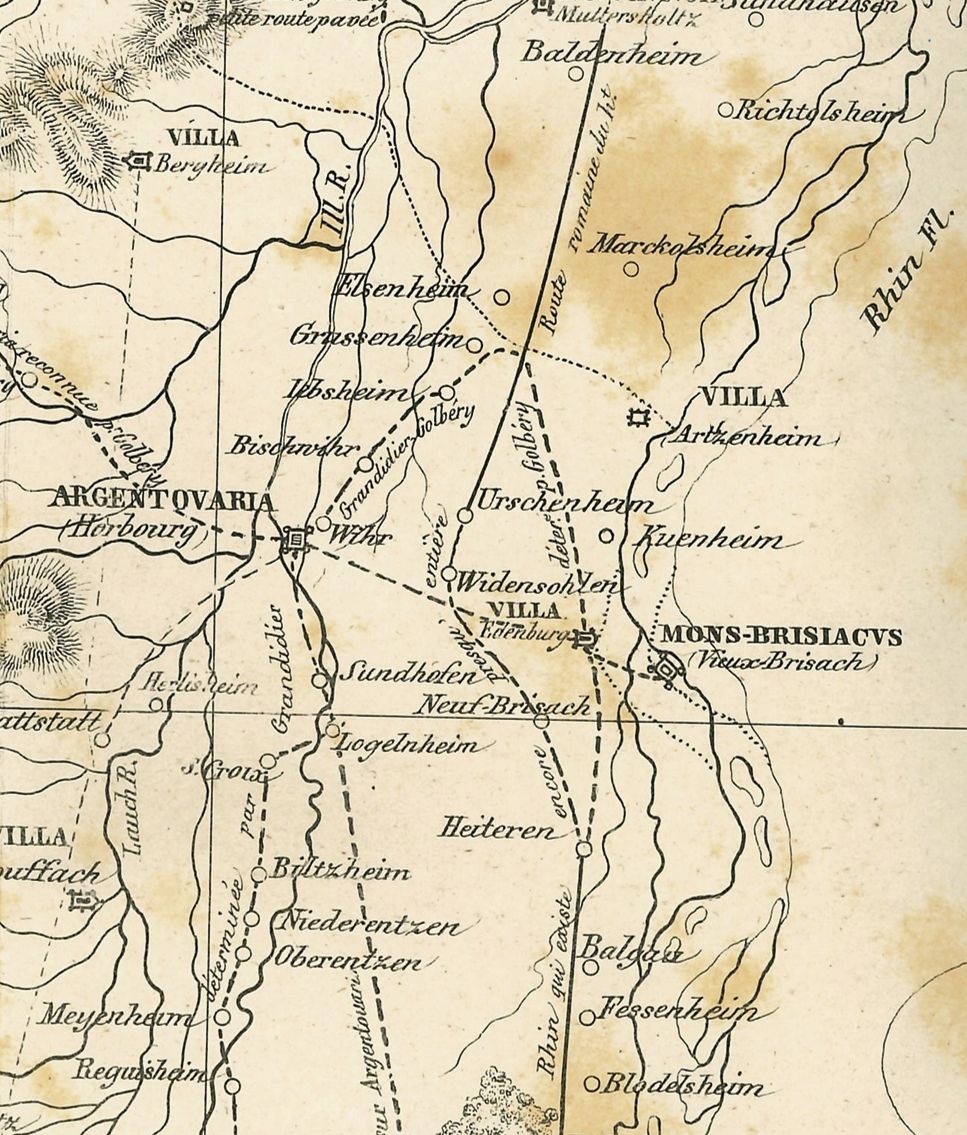En effet, cette voie romaine se trouve assez bien identifié à partir d’Urschenheim jusqu’à Benfeld – en presque ligne droite sur le tracé principalement de chemins ruraux.