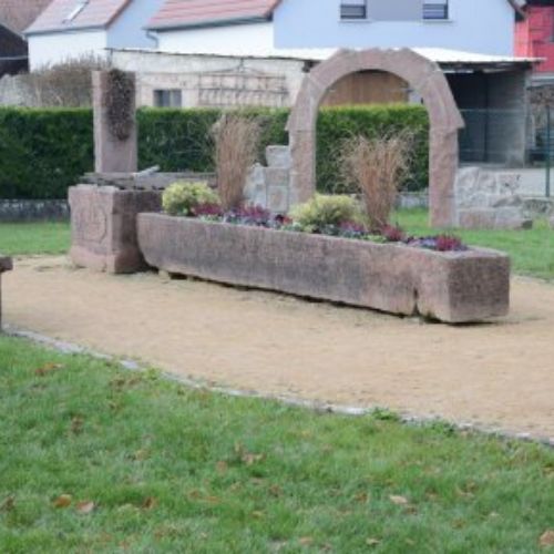 Jusque dans les années 1980 ce jardin potager était cultivé par nos prêtres successifs. Nous avons aménagé l'ancien jardin du presbytère en 2019 pour en faire un lieu d'agrément et de repos. L'auge située à l'arrière du presbytère y a été transférée et un arche en pierre provenant de l'ancienne ferme MULLER, aujourd'hui la mairie, y a été remontée. Ces travaux ont été réalisés notamment lors de la journée citoyenne organisée par la commune en septembre 2019.