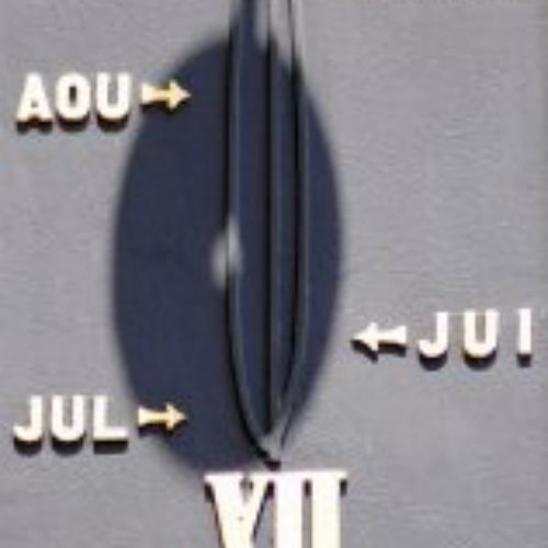 L' « équation du temps » est la différence entre le jour solaire moyen et le jour solaire vrai. Elle est maximale en février (+ 14 minutes) et en novembre (- 16 minutes), et nulle 4 jours seulement par an - vers les 15 avril, 13 juin, 1er septembre et 25 décembre - dont nous retrouvons les points aux intersections de la courbe en forme de 8 avec la ligne droite figurant au milieu du tableau. Notre méridienne intègre l' « équation du temps » par la représentation de la courbe en forme de 8 qui figure en relief sur son tableau. Les conventions établies par l'homme pour régler ses horloges et compter les heures sont les seules responsables de ces singularités.