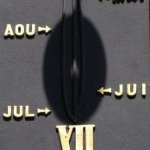 Cette courbe en forme de 8 est jalonnée sur son tracé en relief des mois de l'année. La zone dans laquelle apparaît la tache blanche du soleil au passage du méridien nous indique le mois dans lequel nous nous trouvons. En effet, la terre dans son mouvement de translation autour du soleil pivote sur son axe de rotation. Cela explique que durant l'hiver la position du soleil dans notre ciel est plus basse que durant l'été - ainsi les ombres s'allongent à partir du solstice d'été et se raccourcissent à partir du solstice d'hiver - ce que reflète notre méridienne