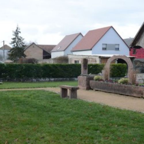 Jusque dans les années 1980 ce jardin potager était cultivé par nos prêtres successifs. Nous avons aménagé l'ancien jardin du presbytère en 2019 pour en faire un lieu d'agrément et de repos. L'auge située à l'arrière du presbytère y a été transférée et un arche en pierre provenant de l'ancienne ferme MULLER, aujourd'hui la mairie, y a été remontée. Ces travaux ont été réalisés notamment lors de la journée citoyenne organisée par la commune en septembre 2019.